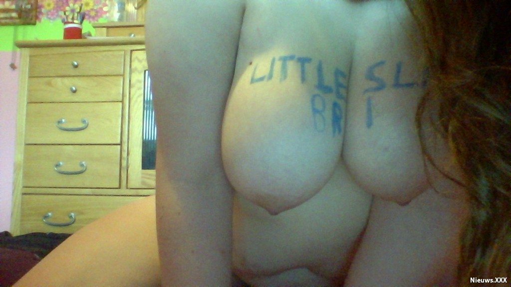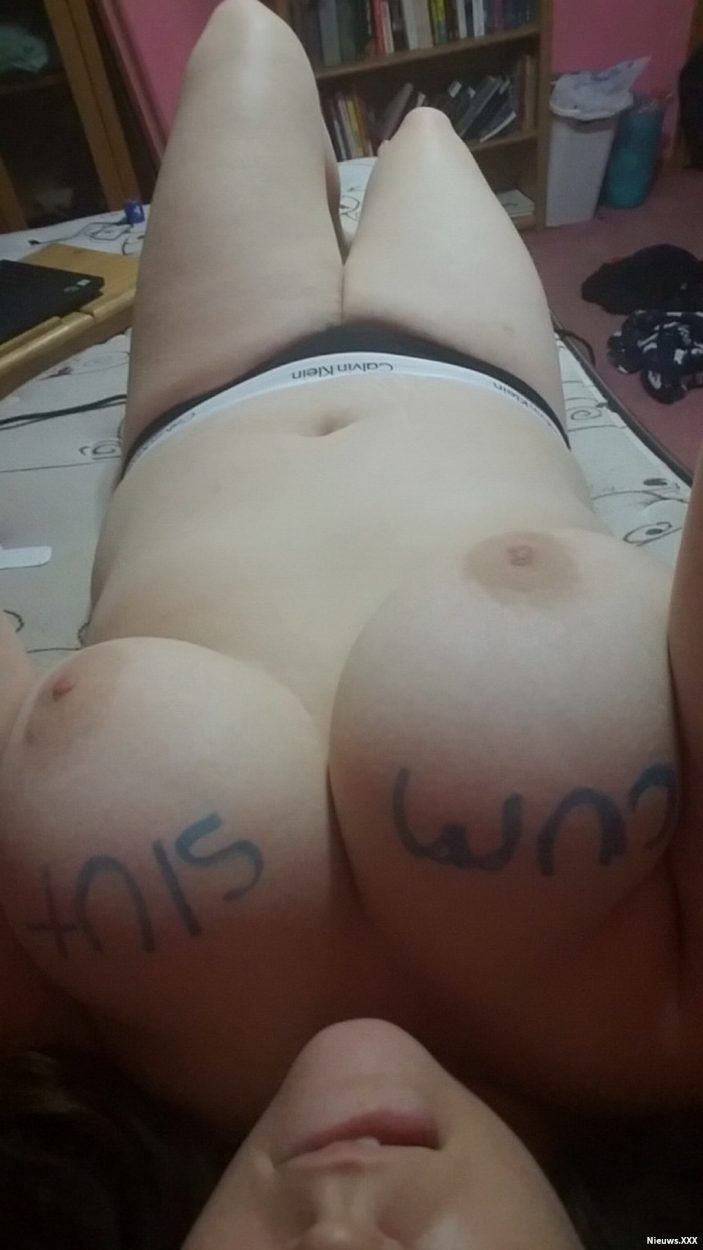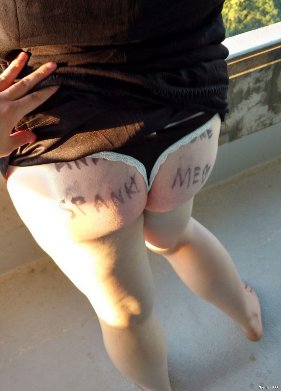 Ze laat haar dikke kont met een zwarte viltstift alles onder kalken met vernederende woorden en ze heeft een buttplug in haar anus zitten.