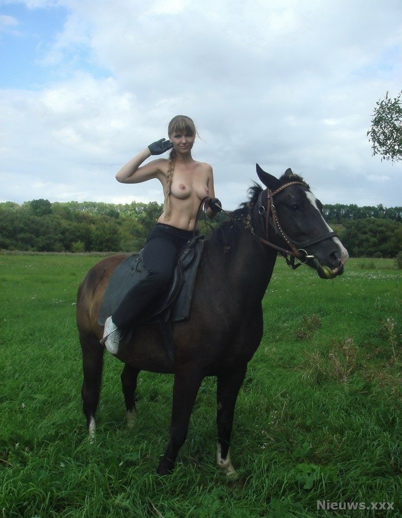 Natuurfoto´s! Daar houden we wel van. Een blonde vrouw gaat een stukkie paardrijden in de natuur, en dat doet zij met haar ontblote bovenhelft. En haar naaktfoto´s op paard zijn nog niet alles, want als verder naar beneden scrolt mag je ook de rest van haar lichaam aangluren.