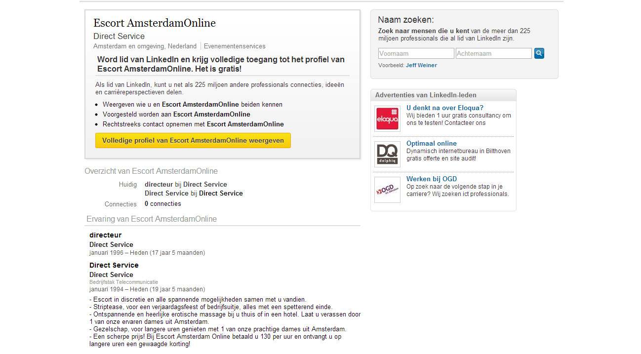 Volgens gebruikersvoorwaarden op Linkedin staat nu vermeld dat het niet toegestaan is om erotische profielen te maken en aan te bieden dat prostitutie of escortdiensten promoot, ookal als het legaal is in een bepaalde land. maar het is te verwachten valt dat ze creatieve benamingen verzinnen om hun praktijken gewoon voort te kunnen blijven zetten en wij zoeken alvast seksprofielen even voor je op!